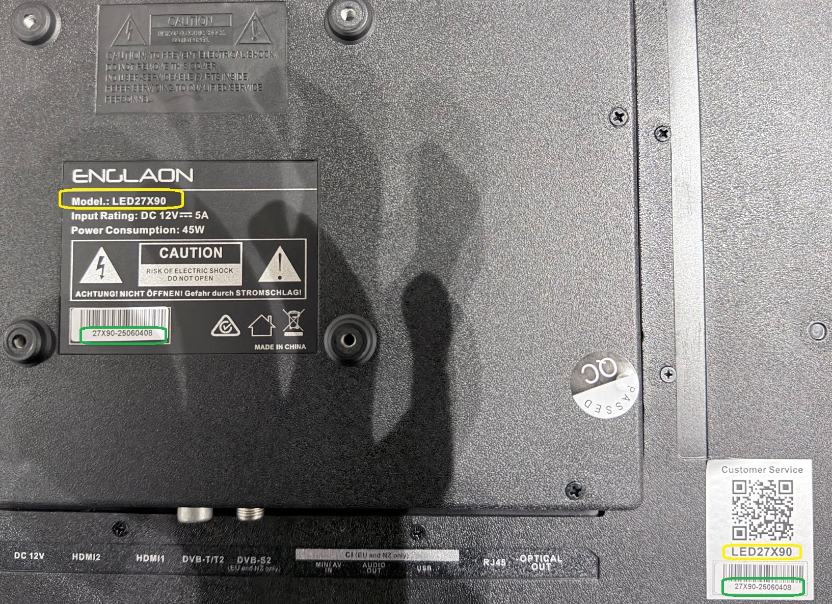 Turn the TV around and look for the information sticker on the rear panel.