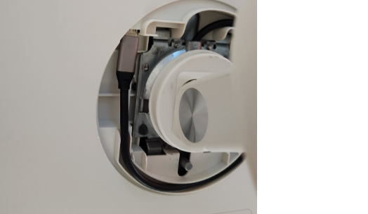hole of the chassis, and connect it with the power cord of the chassis. - Once you are ready to connect the power to the screen, plug the cable coming out of the rod into the USB C port as seen in the images below.